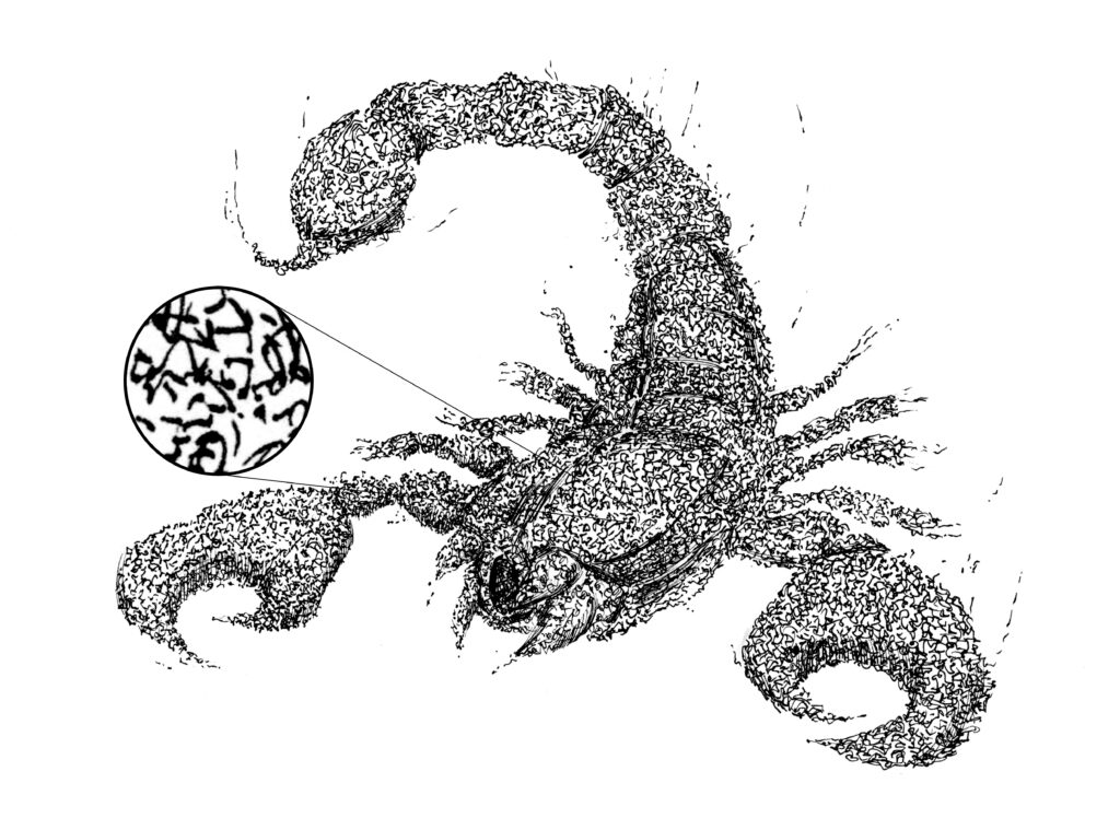 A partir d’aquí, el dibuix es resol amb tinta tradicional, reforçant el caràcter del traç i aportant textura i profunditat a través de la línia.